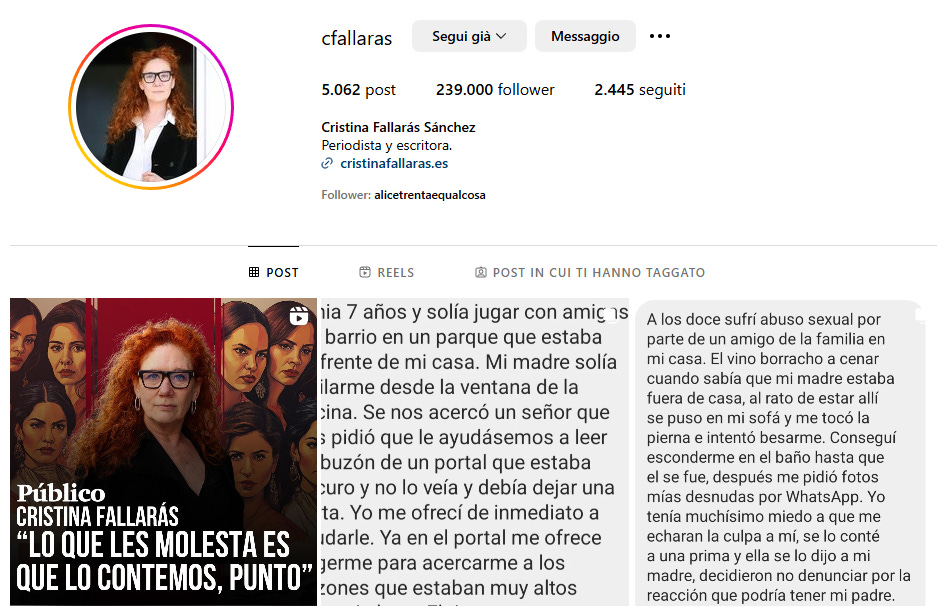 Come ho scritto su Domani (dove trovi un racconto più dettagliato dei vari episodi di molestie e le reazioni della politica), il comune denominatore che unisce questo secondo atto del #MeToo in Spagna è uno solo: il profilo Instagram della giornalista Cristina Fallarás.